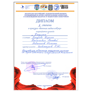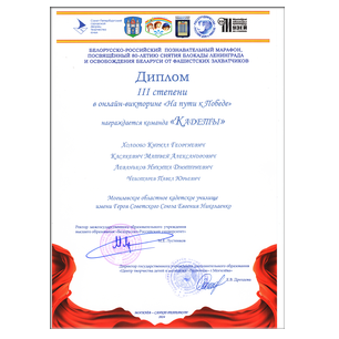 Среди участников познавательного марафона была и команда Могилёвского областного кадетского училища имени Героя Советского Союза Евгения Николаенко. Вице-старшина Кирилл Холдобо, кадеты Матвей Касакевич и Никита Леваньков проявили настоящие бойцовские качества, завоевав второе место и став единственной командой из Беларуси среди призеров. Этот блестящий результат - плод упорного труда и таланта кадет, а также высокого профессионализма их наставников - Павла Юрьевича Чеботарева и Натальи Владимировны Полиненко. Их вклад в победу неоценим!