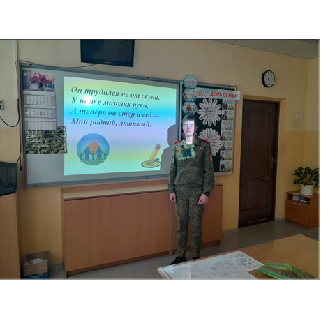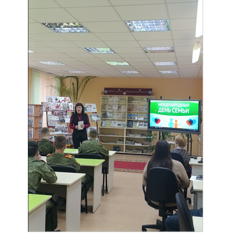 В течение недели в библиотеке действовала тематическая полка "Семейная сага на страницах книг", в фойе транслировались социальные ролики о важности и ценности семьи, была представлена выставка рисунков "Герб моей семьи", а также видео-интервью "У меня счастливая семья". Проведены консультации с родителями на тему "Семейные установки и их влияние на поведение несовершеннолетних", классные часы: "Семья - как много в этом слове…", "Вместе за крепкую и здоровую семью", и воспитательные мероприятия "Семейные традиции. Ценность семьи в современном мире", организованные командирами взводов.