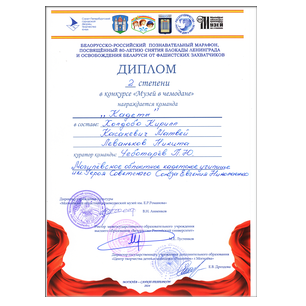 Среди участников познавательного марафона была и команда Могилёвского областного кадетского училища имени Героя Советского Союза Евгения Николаенко. Вице-старшина Кирилл Холдобо, кадеты Матвей Касакевич и Никита Леваньков проявили настоящие бойцовские качества, завоевав второе место и став единственной командой из Беларуси среди призеров. Этот блестящий результат - плод упорного труда и таланта кадет, а также высокого профессионализма их наставников - Павла Юрьевича Чеботарева и Натальи Владимировны Полиненко. Их вклад в победу неоценим!